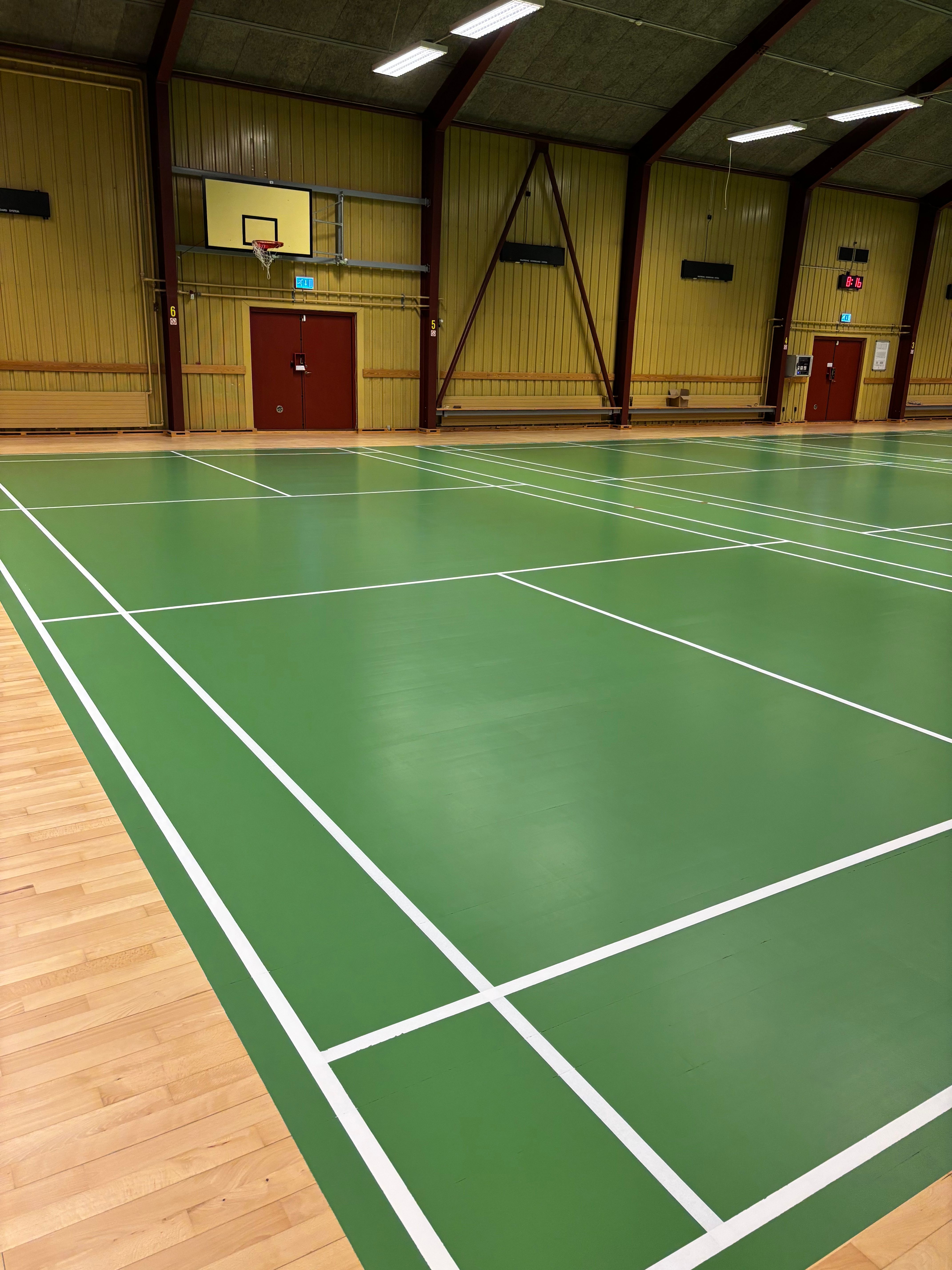 Gulvet i hallen er blevet slebet og streget op i efterårsferien (pga. vandskader efter skybrud i august) Det er blevet super flot! Vi glæder os til at spille på det...